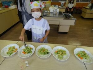 4日(水)、5・6年生は、調理実習をしました。湯で野菜作りをしました。野菜があまり好きではない子どもたちも、自分たちで協力して作った湯で野菜は、おいしかったようです。給食と一緒にいただきました。「おいしかったわ」と子どもたちの声が響いていました。