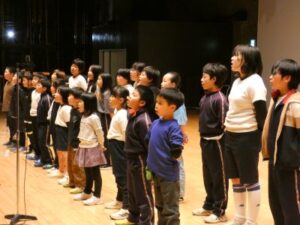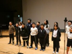 今日は全校で、校歌を収録しに、クラギ文化ホールに行きました。児童の中には、保育園、幼稚園時代に大舞台を経験した子どもがいて、懐かしいと声をかけあっていました。いざ、リハーサルが始まると、元気な歌声が響き渡りました。休憩時間には、ピアノを弾ける子どもたちが一人一曲弾いてくれました。その後、収録本番が開始。一回目の収録は、緊張した様子が見られました。2回目の収録は、バッチリでした。