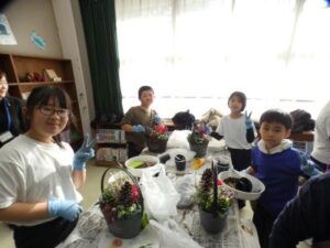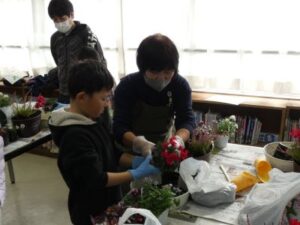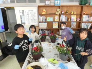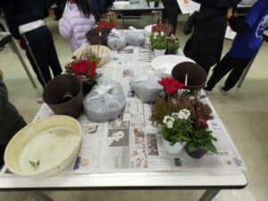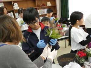 今日の午後は、花育体験をしました。日本ハンギングバスケット協会三重支部の宇野さんと田端さんに来ていただき、クリスマス風の寄せ植えをしました。ビオラ、シクラメン、アリッサリュームなど6種類の花を植えました。寄せ植えをするときに、根っこを少し崩したり、また、ギュッと詰めて寄せ植え、土をかぶせることが少し難しかっですが、児童みんなは、手際よく、先生の話を聞いて取り組みました。子どもたちは、今日、持ち帰りました。ぜひ、ご家庭で飾ってください。