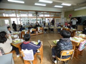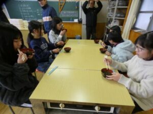 今日は、5・6年生が香肌小学校との交流を行いました。今回は、香肌小学校が松ケ崎小にきてもらい、地域の方々が作ってくれた「あおさの味噌汁」を一緒に食べたり、野鳥の会の方々に来てもらい、堤防から、松ケ崎に生息する鳥や渡り鳥を双眼鏡で見て、説明してもらいました。そのあとは、教室でみんなで給食を食べ、体育館でドッチボールを楽しみました。子どもたちからは、「あおさの味噌汁がとてもおいしかった」「普段は、ドッチボールを低学年の友だちと一緒にしているので、今回は、同学年と一緒にすることで、思いっきり、投げたりすることができてよかった」など、感想がありました。