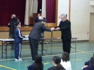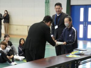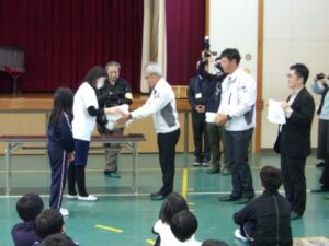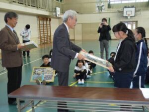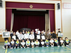今日のお昼休みに体育館で、感謝の会をしました。150周年記念や閉校記念の松ケ崎小学校グッズ等を支援していただいた関係の皆さんに、児童からお礼と学校から、感謝状を渡しました。記念グッズは、住民自治協議会さまから、航空写真とクリアファイル、向陽台高校さまからも航空写真とクリアファイル、丸亀産業さまから、社会福祉協議会の中西さまアイデアのタオルをいただきました。また、今日は欠席でしたが、マルキン製鉄所さまからは下敷き、スポーツショップサカイさまからは、校務員の廣森さんデザインのうちわをいただきました。大切に使いたいと思います。